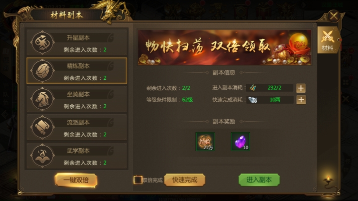 每日精炼副本是获取精炼石的主要途径之一。玩家每天可以进入精炼副本两次,每次完成副本后可以获得一定数量的精炼石。此外,通过消耗金子,玩家可以获取双倍奖励,从而更快地积累精炼石。