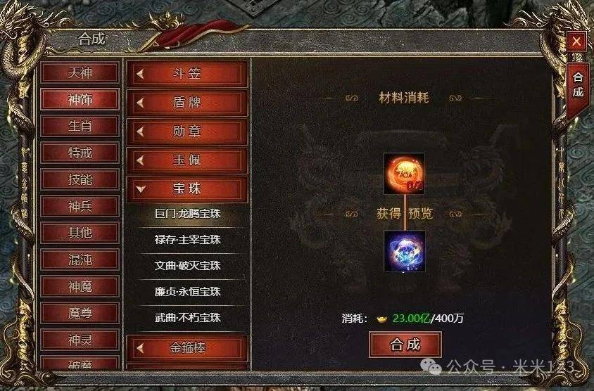 只有 7转及以上的宝珠 才具备合成资格。低于7转的宝珠,尚需通过其他途径继续培养提升。 每一次合成尝试,都需要 消耗巨量的元宝。这是合成操作不可或缺的“燃料”,其消耗量随宝珠等级提升而显著增加,是玩家必须重点储备的战略资源。
