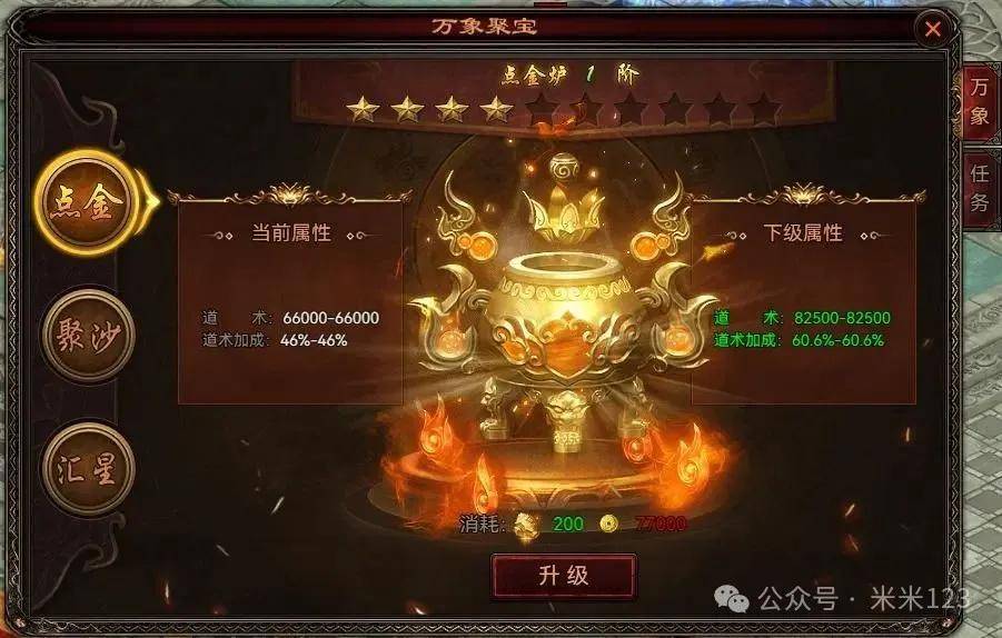 战士、法师(主攻手):优先倾注资源升级点金炉!极致的攻击力与攻击加成是你撕裂战场的利刃。聚沙环与汇星烛的生存属性则作为中后期保障。