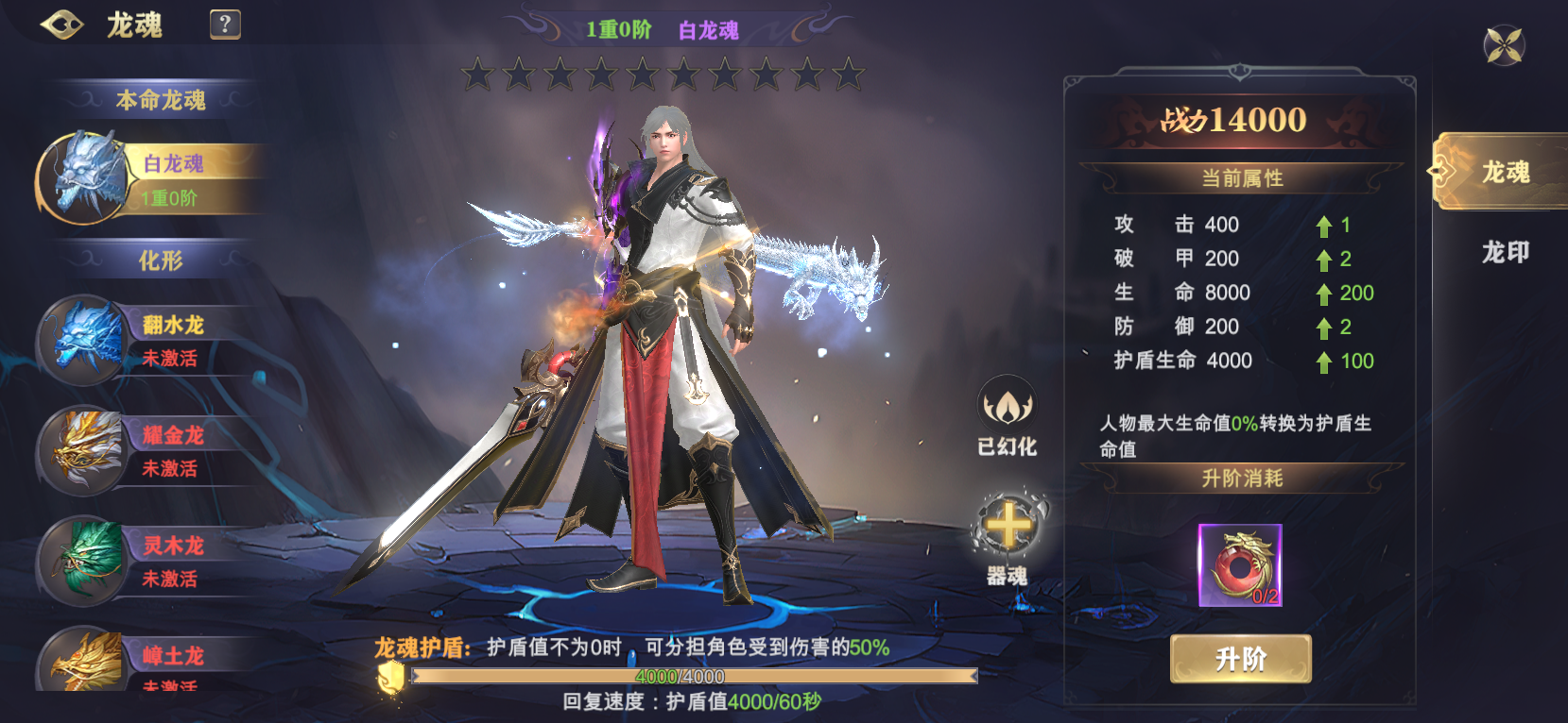 2、收集龙魂幻化可提升龙魂护盾的强度,不需要出战幻化其数值提升依然生效;
