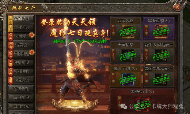 我们先开下开服前七天签到可以领取的奖励,首先是万灵残卷,可以用来提升我们的宝术等级,然后就是我们的黑悟空5天体验,第五天就可以领取我们永久的筋斗云,第七天直接激活永久黑悟空皮肤。下面给大家介绍一下筋斗云和黑悟空的基本属性。