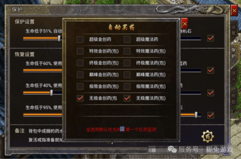 原始传奇黄金会员自动买药在更新过之后可以自己设置了,在保护页面的右下角可以看到一个“药”的图标,点进去之后直接设置成最大的药水即可,不过有些药水也是有开服天数才能解锁的,对于新区玩家来说: