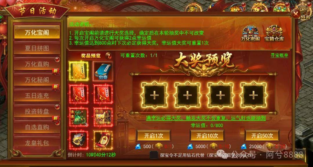 万化宝阁是《维京传奇》中一个极具特色的抽奖系统,其运作方式与传统抽奖有所不同,主要包含以下几个关键点:开启宝阁前,玩家需要先进行大奖选择,这一选择在本轮抽奖过程中不可更改。这一设计让玩家能够有针对性地获取自己最需要的奖励。每次开启万化宝阁可获得2点幸运值,当幸运值累积达到800点时,下次开启必定获得预先选定的大奖。系统允许玩家对幸运值大奖进行一次重置,这为玩家提供了调整策略的机会。