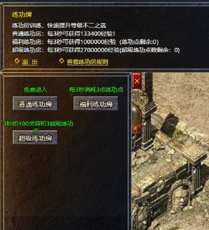 练功房是《传奇霸业》中提升经验的重要场所,分为普通练功房、福利练功房和超级练功房: