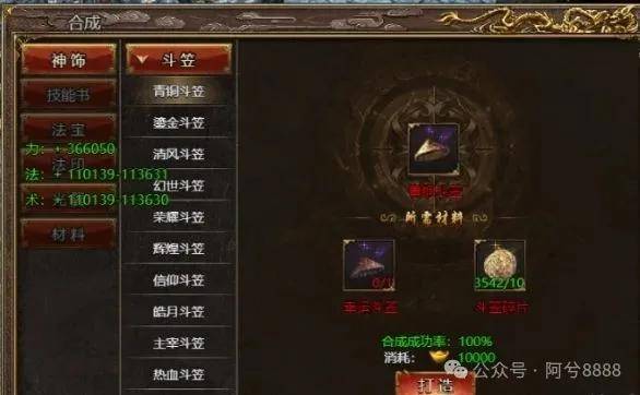 想要获得9阶及以上的高级斗笠,玩家有两种途径:挑战高级BOSS直接掉落,通过合成系统制作,在神饰合成界面的斗笠专区,玩家可以使用当前等级斗笠+斗笠碎片+绑定元宝进行合成。值得注意的是,斗笠合成100%成功,无需担心失败风险,这让资源投入变得更有保障。