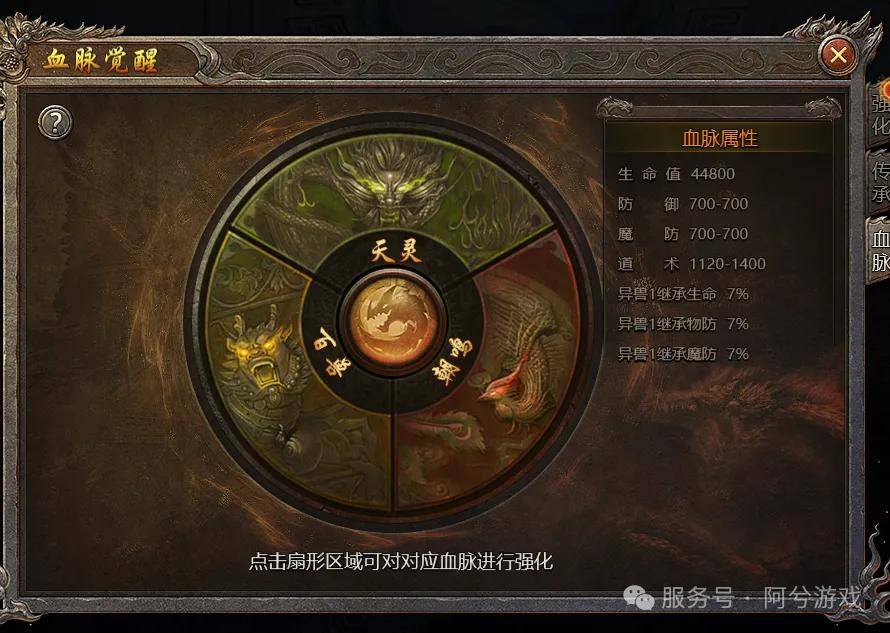 天灵血脉:激活四神异兽血脉,可大幅提升一号出战位异兽的生命与防御属性,使其成为坚不可摧的前排守护者。