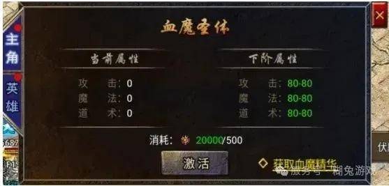 升级血魔需要的基础材料血魔精华/金刚之精这些材料获取途径比较多,升级到后期还需要血魔心脏/魔血油等材料。血魔精华/金刚之精等在各类活动中都有提供,而血魔心脏/魔血油在开服前期获取途径较少,到游戏后期也会存在于各类游戏活动中,非常容易获取。