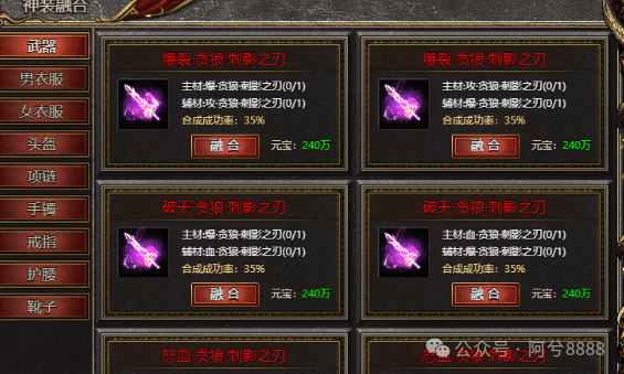 在【第二大陆】的【神装融合】处,玩家可以将低阶装备融合为更高阶装备。这里有几个关键要点需要注意: