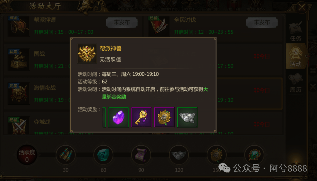 哈喽,大家好啊,征战王权九州王朝封神策王者纪元折扣服《龙途天下》,【帮派神兽】活动是每一位玩家每周绝不能错过的福利盛宴!它耗时短、奖励丰厚,是获取大量绑定元宝和核心养成材料的捷径。本文将为您带来最全的帮派神兽活动攻略,助您精准发力,十分钟赢取满额奖励!更多游戏资讯,游戏福利礼包豪礼,充值折扣返利添加客服V+erty34899