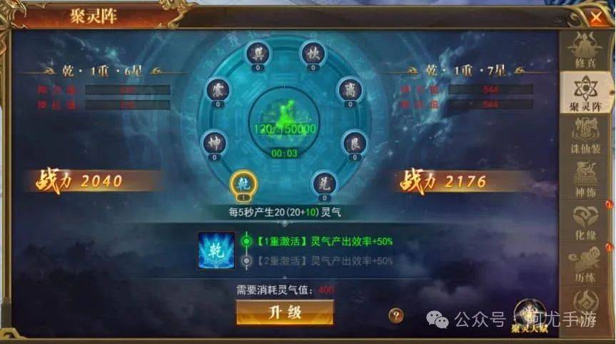 开启天界即可激活聚灵阵,激活后无时无刻都在产生灵气,灵气需要及时消耗,达到贮存上限后不在增加灵气