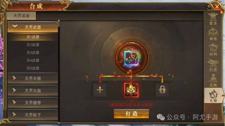 --使用225阶及以上战装和天界材料可打造天界战装,天界战装比普通战装多至尊属性,可获得大量天界大陆属性