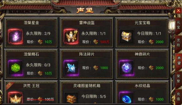 声望商城:零氪/微氪玩家获取雷神套装的辅助途径。每个雷神部件需要500万声望兑换。