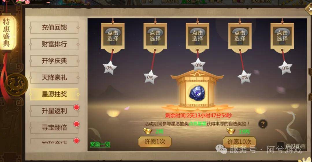 玩家可花费金子许下星愿,单次许愿消耗一定金子,但许下10个星愿不仅更值,还能享受额外优惠!建议金子充足的玩家优先选择十连,性价比更高。