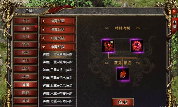 在“造神”NPC处进行合成,提升神魔战指的等级。