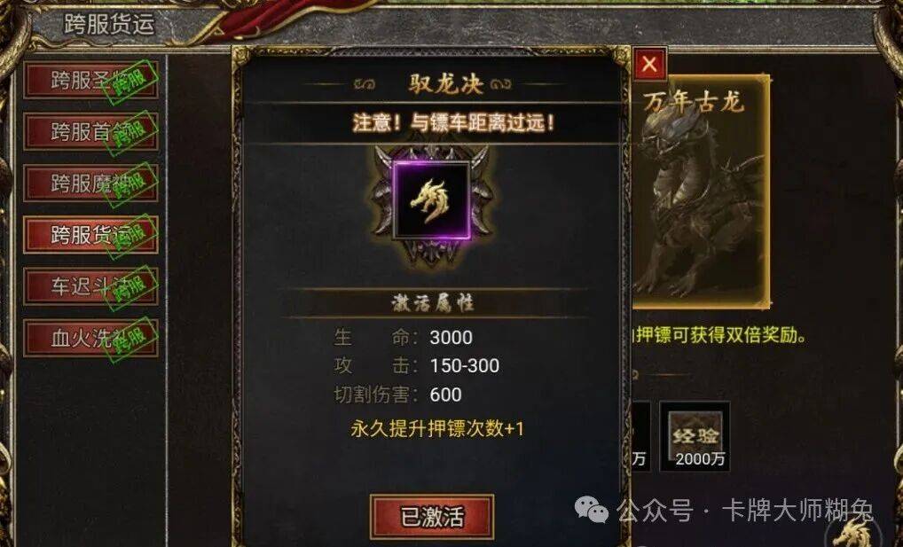 白蛇传奇折扣服驭龙决的作用就是可以每天增加一次运镖的次数,也就是上限三次,看上去每次运镖奖励好像不咋滴,但是中后期奖励会多个魔尊宝珠的碎片,这个非常重要,每天等双倍时间,然后多拉一次,长久累计下去这个奖励可不是多了一点半点的哦!
