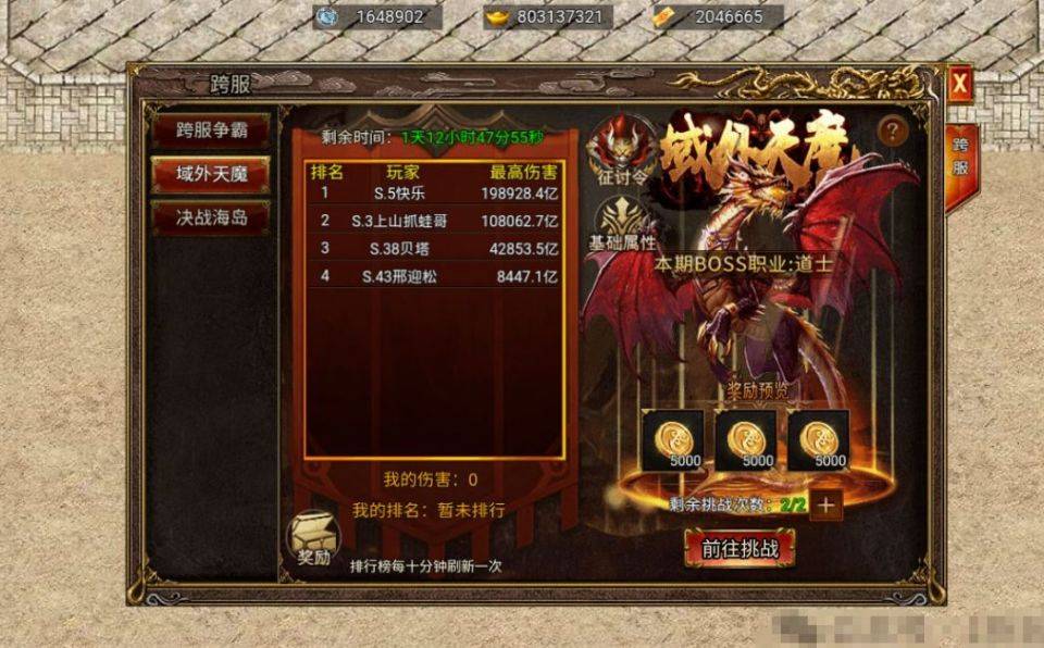 开区53天开启,域外天魔每天有挑战次数限制,每日凌晨 5 点重置。所有符合挑战条件的玩家都可进入场景争夺 BOSS,BOSS 被击败后会进入复活时间,复活期间不可挑战。