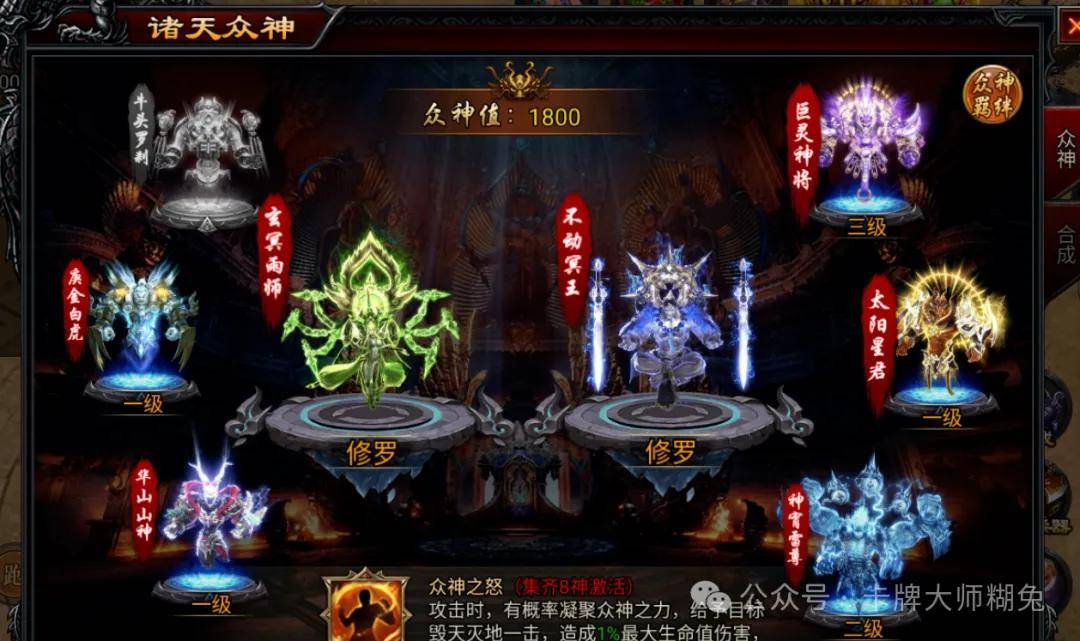在邪兵谱游戏中,诸天众神是个很重要的玩法,集齐之后有个众神之怒技能,攻击时有概率造成1%的最大生命值伤害,并使其陷入混乱状态。众神等级越高技能效果越好。