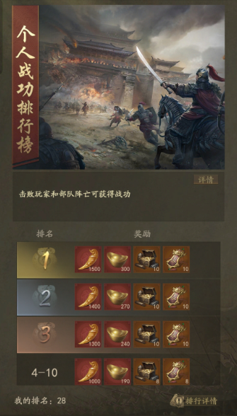 战功排行榜:晚上6点后,玩家可以随意开战,积累战功。通常情况下,大佬玩家会进入前十,普通玩家争取进入前50,前20会更有优势。此时不建议将加速用完,因为第二天下午6点的南洋王宫争夺战才是重点,抢到的奖励非常丰厚。