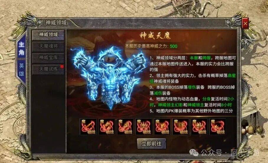 在《伏魔战歌》中,神威领域是一个重要的打宝地图。以下是其详细介绍:开服 91 天即可开放。神威领域分为本服和跨服两层,跨服地图可通过本服地图传送进入,本服的怪物难度比跨服的高。