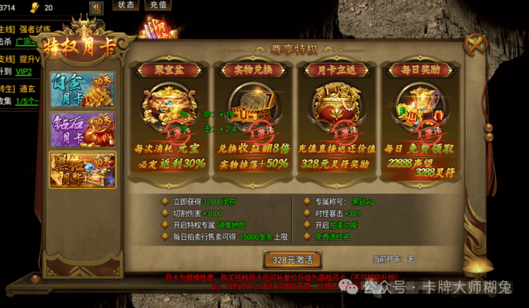 白金月卡30,能满足日常消耗,小日子比较适宜!每天可通过实物回收获得150*2的金条,30天获得9000灵符。