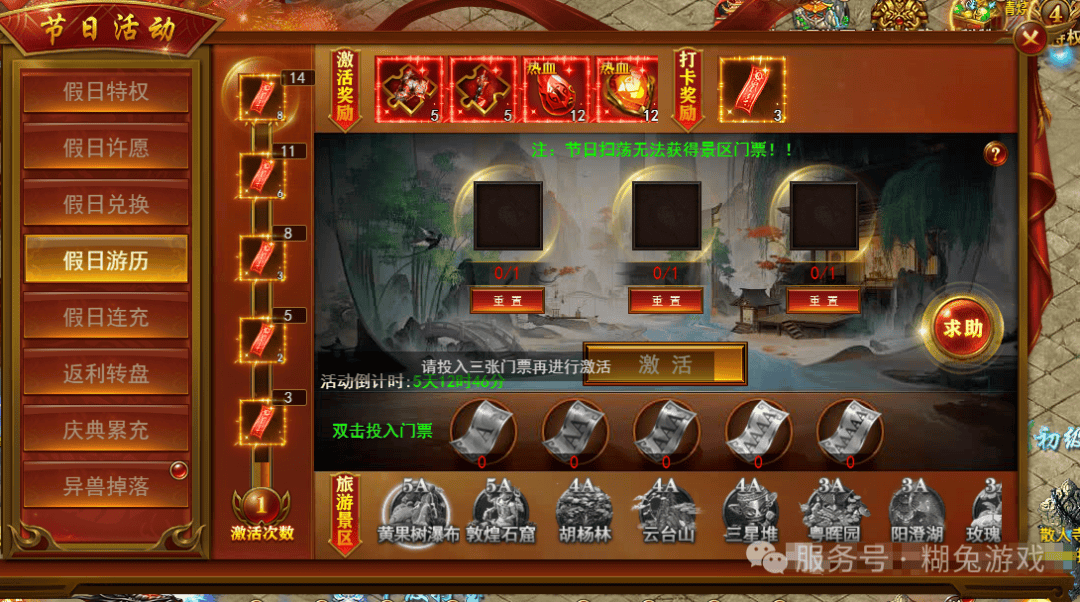 首先是打怪收集1A到5A景区的各种门票,1A景区很好办,投入任意三张门票都能激活,从2A开始就比较难了,要使用1A-5A门票中的任意三张组合激活(比如1A+2A+3A景区门票),而且不是一定激活成功的,失败的话门票不退。