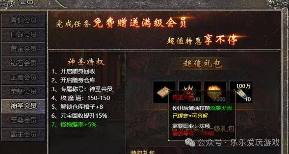 伏魔战歌霸世群雄折扣包服烈焰天下流星火雨是法师职业的一个重要技能,玩家可在开服31天内,通过购买神圣会员的超值礼包获取。在游玩过程中,玩家跟随主线任务获取满级会员令后即可升级满级会员,在获得特权礼包后可逐级购买超值礼包获取一系列技能及道具。其中,神圣会员内的超级礼包就有流星火雨技能。玩家可消耗技能书页、气之结晶、顿悟印记等道具对技能进行升级从而提升玩家战力。