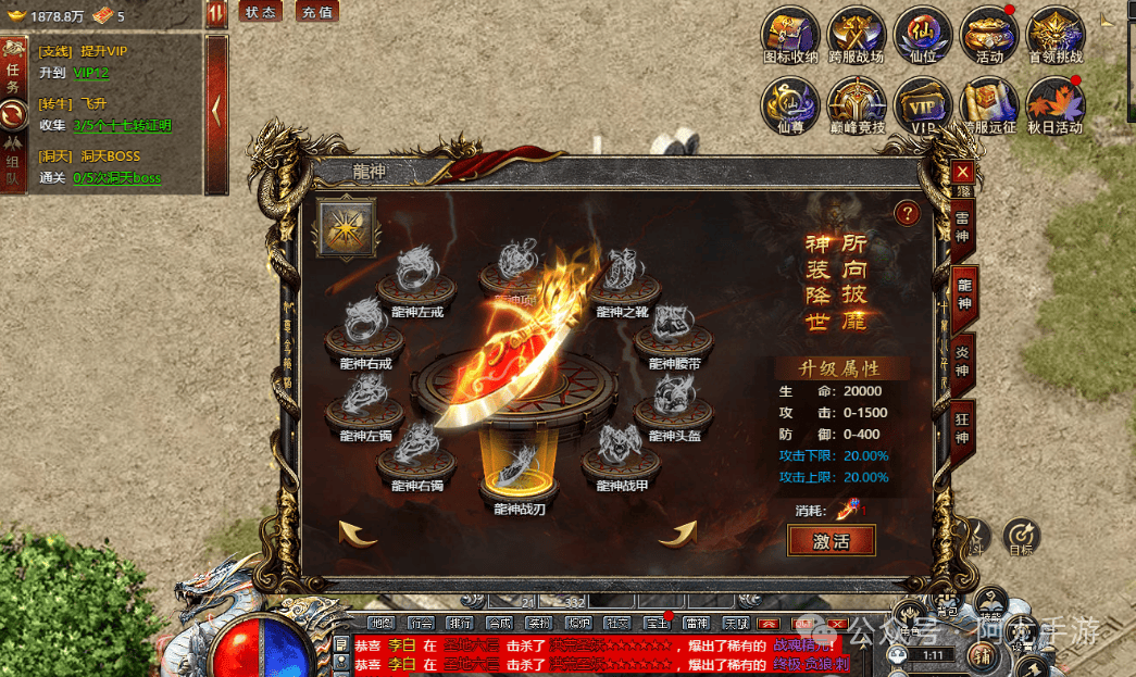 其次,运营活动也会提供龙神装备材料,玩家可通过参与这些活动来获得材料,进而激活和升级龙神装备。例如,上古秘境和深渊夺宝活动是获取黑暗宝玉的主要途径,其中上古秘境的黑暗宝玉掉落率为0.5%,深渊夺宝为0.75% 。虽然深渊夺宝的掉落率略高,但从累积奖励和保底机制来看,上古秘境更为划算。