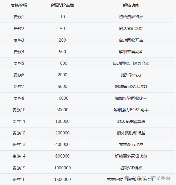 随着贵族等级的提升,玩家将解锁更多强力功能:永久增加攻击力、贵族专属副本boss、激活幽冥弑魔盾、经验回收提升10%。