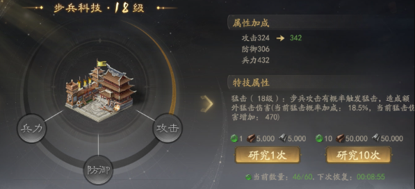 兵营科技主要提升兵种的攻击、防御和兵力这三个属性。升级兵营科技需要注意以下几点: