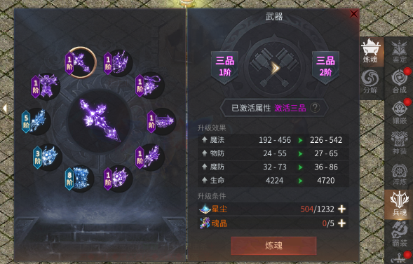 总之兵魂系统在《傲世龙城》中对战力的提升非常显著。通过合理获取和使用星尘,同步升级10个兵魂部件,玩家可以获得强大的属性加成。兵魂试炼是获取星尘和其他重要材料的重要途径,建议玩家定期参与。