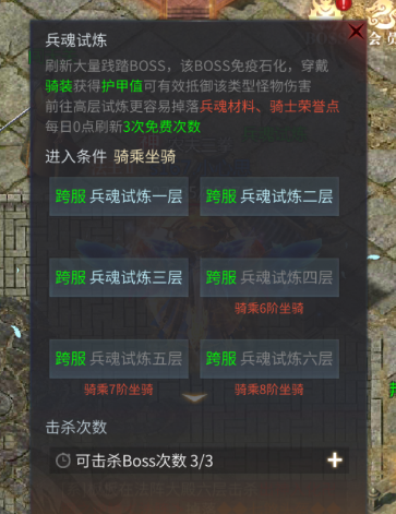 进入兵魂试炼副本需要骑乘3阶以上坐骑,更高坐骑品级可进入更高层地图。