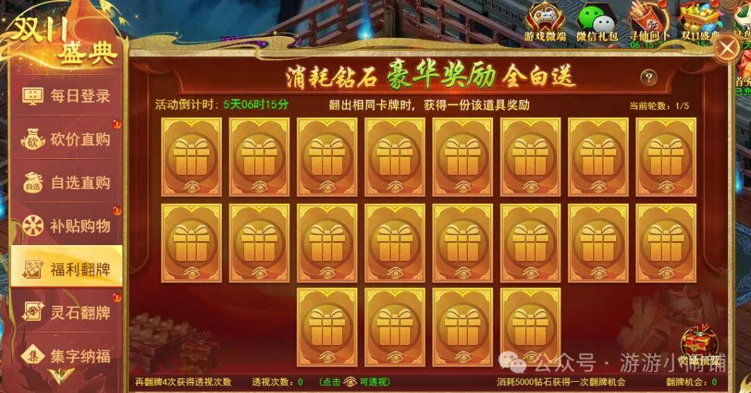开天西游重回西游折扣包服福利翻牌共计5轮,每轮共计可获得的奖励可在奖励预览查看。每消耗5000钻石获得1次翻牌次数,(次数可累积到下轮),翻出两张相同卡牌,获得一份该卡牌内的奖励。翻牌4次可获得1次透视次数,通过透视查看卡面内容。(本轮获得的透视次数仅在本轮可使用,每轮最高可获得4次)。