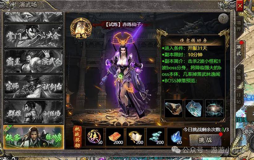 伏魔战歌演武场副本每日3次,所有演武场共享次数心 招中途退出副本也消耗次数,副本奖励正常发放。解锁高级拜帖可进入更高级的演武场,副本内第四波刷新武道首领,击败有概率掉落逸闻装备。