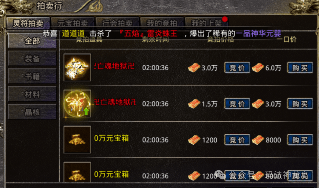 拍卖行还可以上架一些道具材料等,比如经验丹,比如转生道具和材料等,比如荣誉之魂,这些都是可以直接从拍卖行中购买到的。