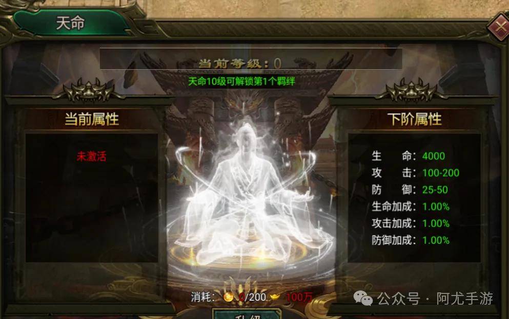 升级天命等级可激活羁绊,天命可使用天命石提升,天命石可通过仁道塔、天命炼制、天命直购、天命投资获取。首次激活可免费选择一次羁绊效果,不满意羁绊效果可用觉醒石刷新。