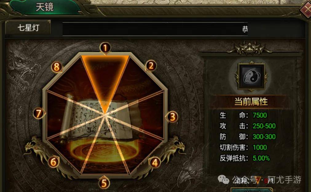 在猎魔无双游戏中七星灯可以通过BOSS挑战传说有几率掉落获取,天境七星灯可增加升生命、攻击、防御和切割伤害等基础属性,每个部位还具备反弹抵抗、伤害反弹。忽视格挡、格挡免伤、PK减免、PK增幅、伤害减免和伤害加成等特有属性。