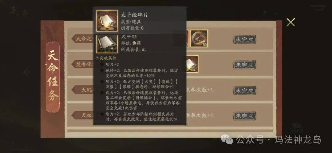 太平经是个全新的装备,而且楼主推测非常强力,足以替代尉缭子等,加6点智力、2点统率,增加负面状态,并且诸葛亮的轮回技能(需要对方火灾才能触发)非常合适使用太平经。第五条属性搭配德印,对抗套装的能力提高。