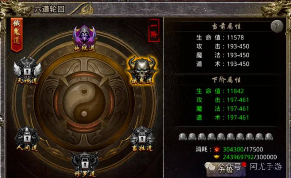 玩家可消耗【六道之力】的材料,来提升六道轮回的等级。当达到每阶10级时,需要消耗【血龙玉】来进行突破,血龙玉可通过商城购买或击败十方以上BOSS获得。