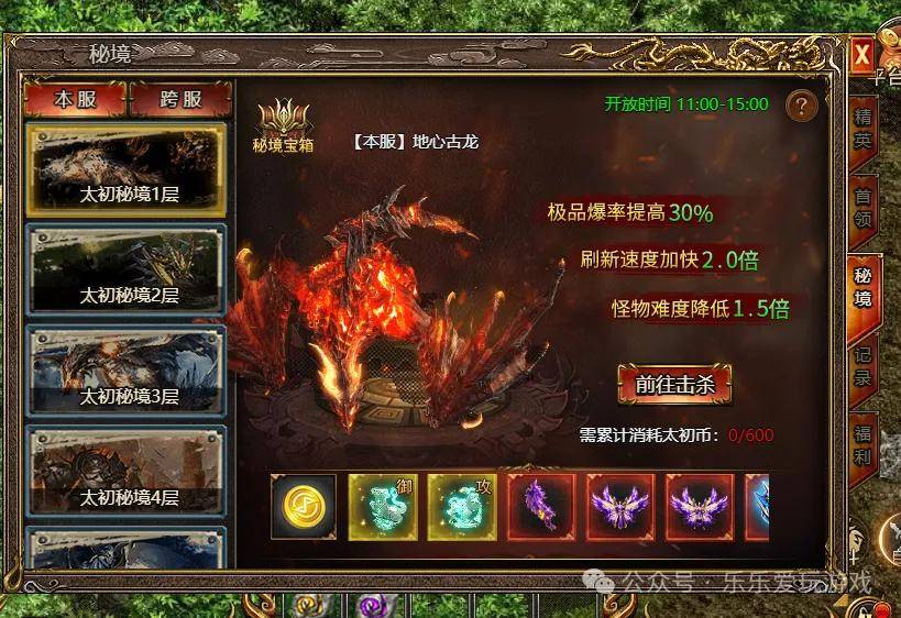 上古战歌折扣渠道赏金传奇暗黑先锋斗帝传奇太初秘境本服开放时间:11:00-15:00太初秘境(跨服)开放时间:19:20-22:00。太初秘境本服和跨服各分为6层,累计消费太初币满足条件即可进入秘境。