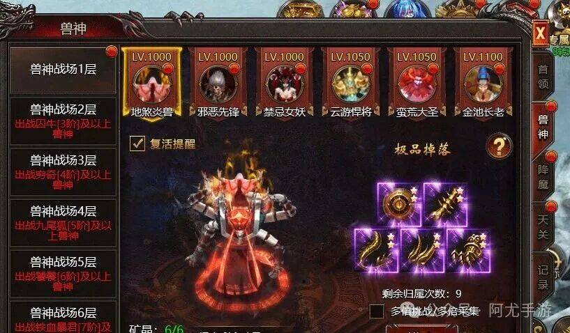开服22天开启兽神战场,开启后可挑战全新的兽神BOSS;兽神BOSS为个人归属,玩家每天有3次归属次数,每天0点刷新,当天未用完的次数次日可叠加,最多叠加至9次;!兽神战场内分布着矿晶和矿铁,玩家每天有2次矿晶采集次数和8次矿铁采集次数,矿晶采集次数最多可叠加至6次,矿铁采集次数不可叠加。