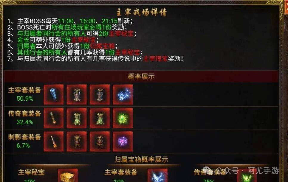 主宰BOSS每天11:00、16:00、21:15刷新;BOSS死亡时所有在场玩家必得1份;与归属者同行会的所有人可得2份主宰秘宝;会长可额外获得1份主宰秘宝;归属者本人可额外获得1份归属宝箱;其他行会的所有人都有几率获得1份主宰秘宝;与归属者同行会的所有人有几率获得传说中的主宰瑰宝!