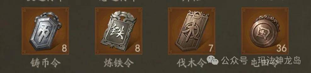 铸币令、伐木令、炼铁令、屯田令是我们种地必不可少的令牌。