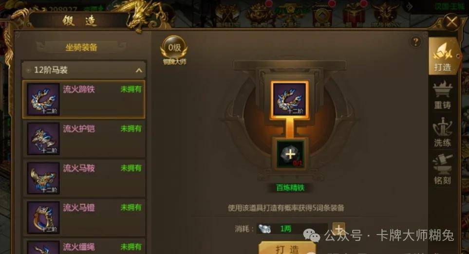 第三步:选择打造。在打造界面选择对应部位的马装,将准备好的材料依次放入打造槽,注意材料品质不要选错;