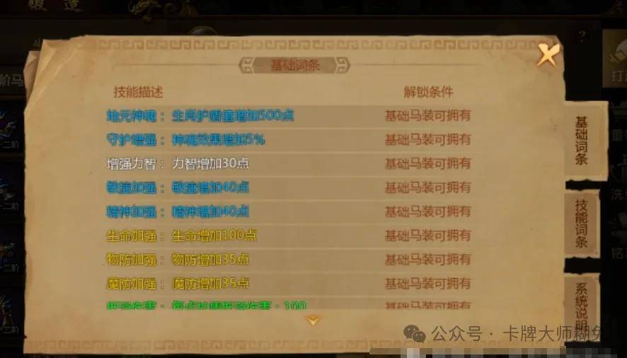 打造完成后,千万别忽略马装的灵魂锁链属性——这是马装战力的核心加成点。和角色装备不同,马装的灵魂锁链不会提供减伤、反射、忽视等特殊效果,而是加成智力、体质、精神、力量、敏捷这五大基础属性,每一件马装都自带其中一种属性的灵魂锁链。