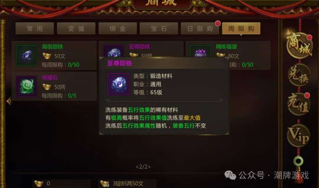 至尊陨铁:洗练装备五行效果的稀有材料有极高概率将五行效果值洗练至最大值洗练后五行效果属性随机,装备五行不变。