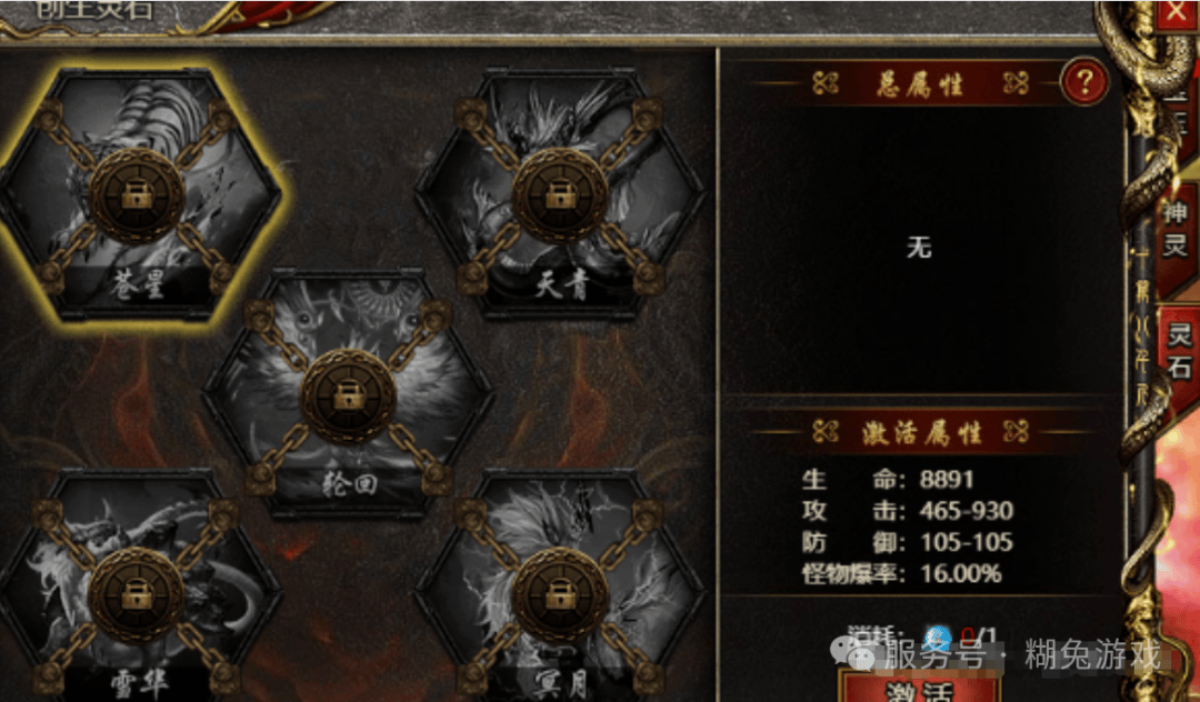 创生灵石内有五只未激活的神兽,他们与装备中的灵石对应,激活后获得和灵石同等的加成,激活属性随灵石等级变化。玩家可通过运营活动等获取创生宝玉,在【合成】-【创生灵石】中合成相应的创生灵石。