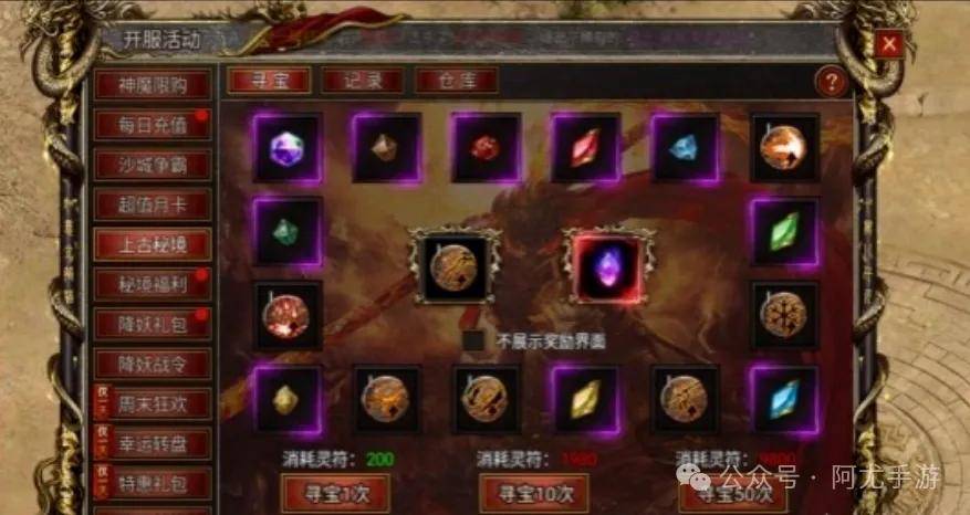 秘境寻宝达到一定次数还能获得奖励,有大量的元宝、极品源石和黑暗宝玉,总结一下就是这个活动主要是用来搞铭文和黑暗宝玉的,老区的兑换里已经没有雷神装备了,只有更多的铭文和技能书。