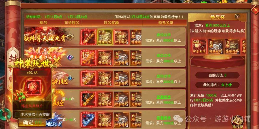 开天西游折扣包服封神榜-充值榜说明:充值1000元以上可参与充值排行,排行榜持续3天,充值排行以最终结束时消费为最终榜单!未进入前10玩家满足参与奖条件可获得参与奖,充值排行每5分钟刷新一次,最后半小时每1分钟刷新一次。