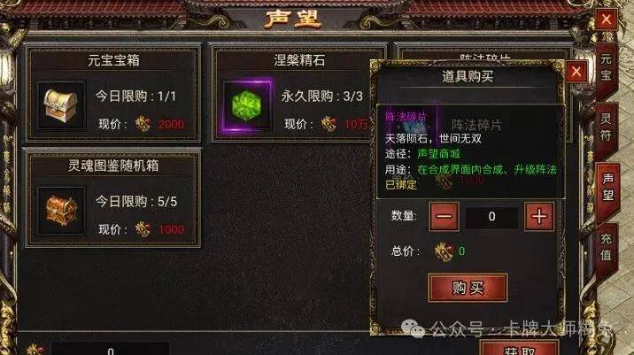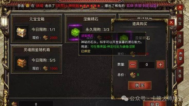 首先就是阵法碎片,前期多一个阵法装备加成还是非常高的,然后就是涅槃精石,可以在傲来国神龙柱处为装备进行涅槃,加大量属性,不过永久只能限购3次,至于剩下的元宝和灵魂图鉴箱子性价比就不高了,没必要除非特别急需。