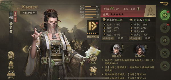 灵罡:15级时,全军对文官伤害+50%。这一天赋让黄月英在对抗文官时具有显著优势。